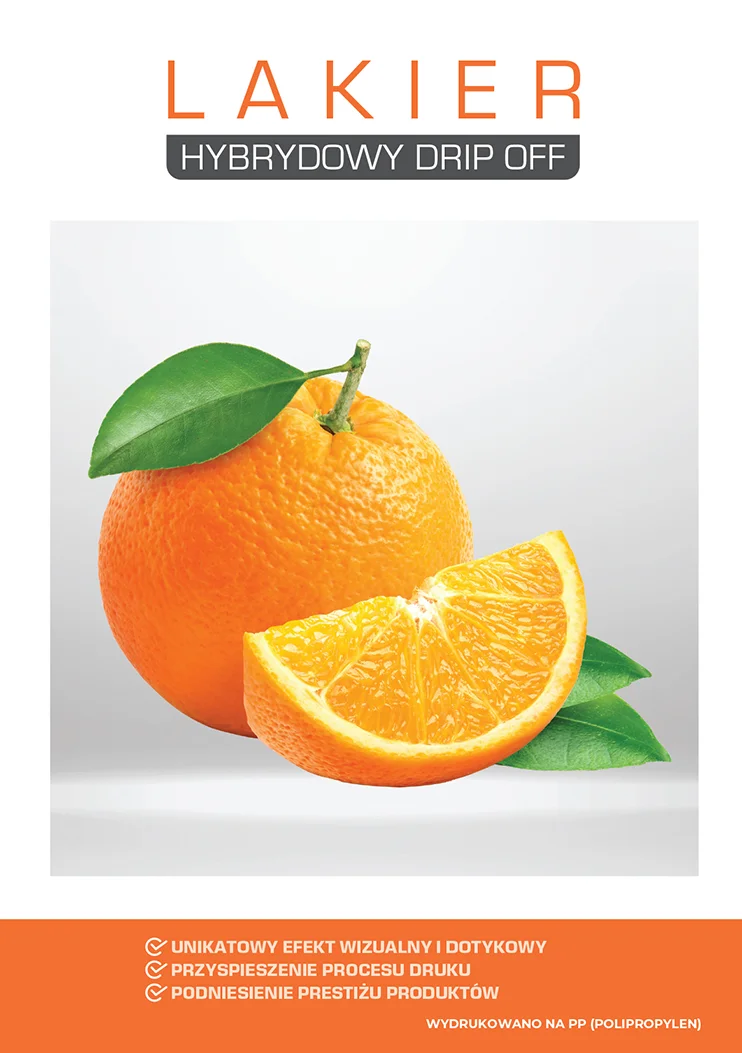 Technologia lakierowania hybrydowego „drip off”pozwala na podłożu plastikowym uzyskać wyjątkowy efekt wizualny na wydrukach.